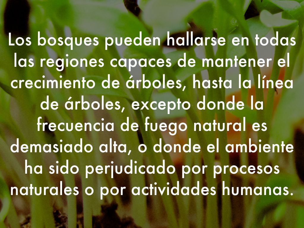 Los bosques pueden hallarse en todas las regiones capaces de mantener el crecimiento de árboles, hasta la línea de árboles, excepto donde la frecuencia de fuego natural es demasiado alta, o donde el ambiente ha sido perjudicado por procesos naturales o por actividades humanas.