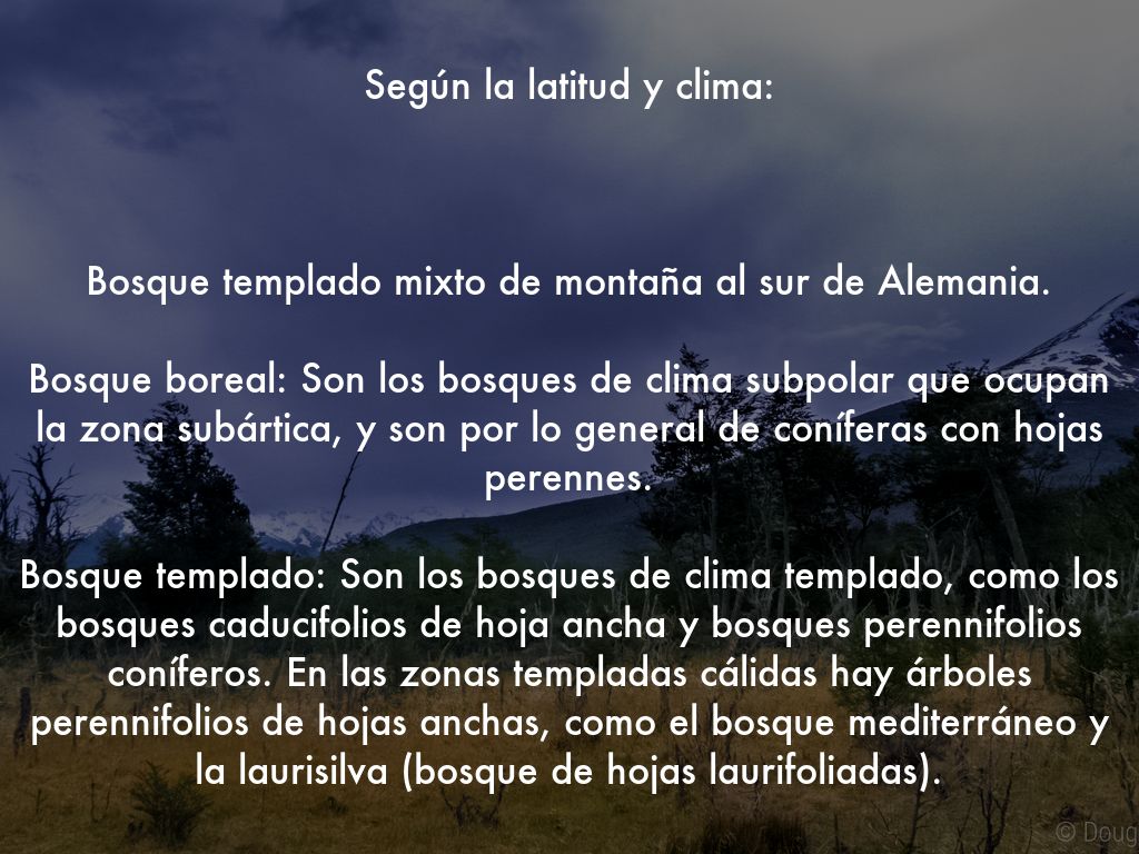Bosque boreal: Son los bosques de clima subpolar que ocupan la zona subártica, y son por lo general de coníferas con hojas perennes.