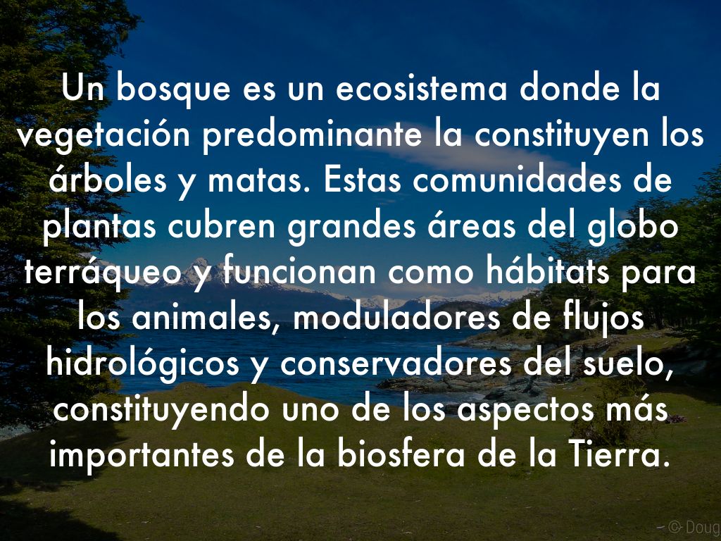 Un bosque es un ecosistema donde la vegetación predominante la constituyen los árboles y matas. Estas comunidades de plantas cubren grandes áreas del globo terráqueo y funcionan como hábitats para los animales, moduladores de flujos hidrológicos y conservadores del suelo, constituyendo uno de los aspectos más importantes de la biosfera de la Tierra.