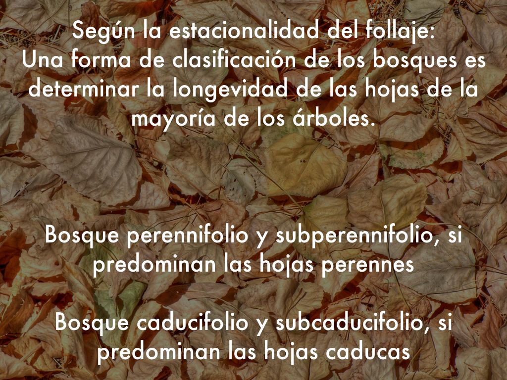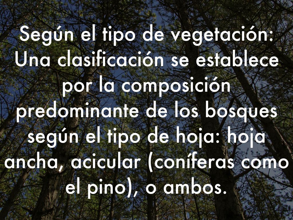 Según el tipo de vegetación: Una clasificación se establece por la composición predominante de los bosques según el tipo de hoja: hoja ancha, acicular (coníferas como el pino), o ambos.