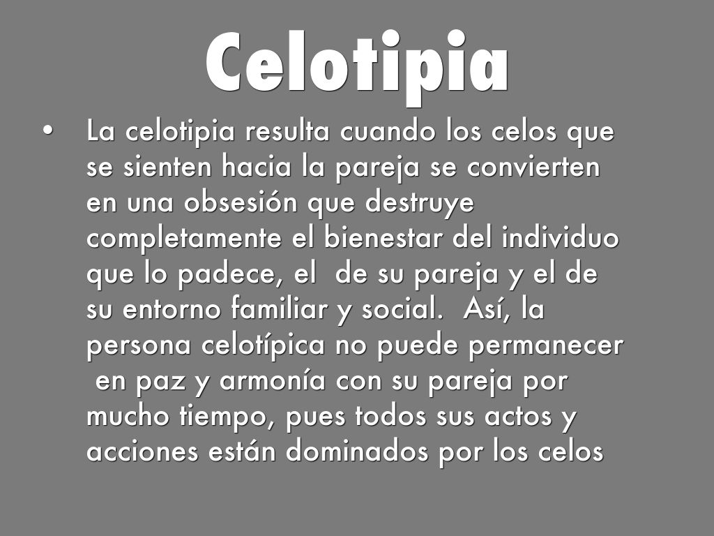 La celotipia resulta cuando los celos que se sienten hacia la pareja se convierten en una obsesión que destruye completamente el bienestar del individuo que lo padece, el de su pareja y el de su entorno familiar y social. Así, la persona celotípica no puede permanecer en paz y armonía con su pareja por mucho tiempo, pues todos sus actos y acciones están dominados por los celos la inseguridad que sienten.