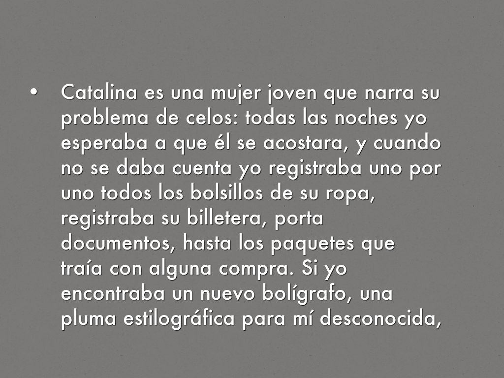 Catalina es una mujer joven que narra su problema de celos: todas las noches yo esperaba a que él se acostara, y cuando no se daba cuenta yo registraba uno por uno todos los bolsillos de su ropa, registraba su billetera, porta documentos, hasta los paquetes que traía con alguna compra. Si yo encontraba un nuevo bolígrafo, una pluma estilográfica para mí desconocida, una tarjeta de visita con el nombre de una mujer, un nombre raro escrito en su agenda, en fin, cualquier cosa, yo montaba en cólera y no podía evitar la escena de celos. A veces me reprimía y no lo exteriorizaba para no despertarle o no mostrarme en forma llamativa, pero por dentro yo ardía. Cualquier cosa que yo encontraba en esos registros servía para convencerme de que mi marido me había engañado y traicionado con otra mujer. No lo podía evitar. Si a la mañana siguiente él, antes de salir de casa se portaba muy amable y cariñoso conmigo, yo estaba convencida de que el muy traidor lo hacía para engañarme y disimular, y de que ya partía a encontrarse con la otra.