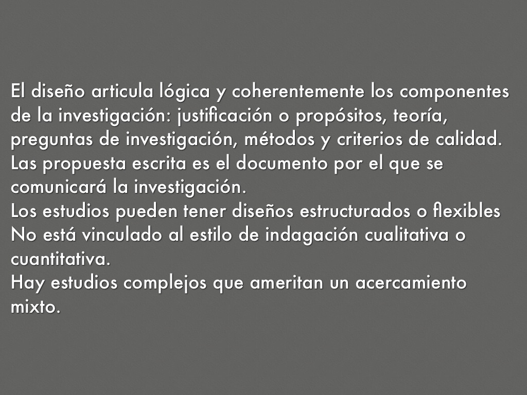 El diseño articula lógica y coherentemente los componentes de la investigación: justificación o propósitos, teoría, preguntas de investigación, métodos y criterios de calidad.