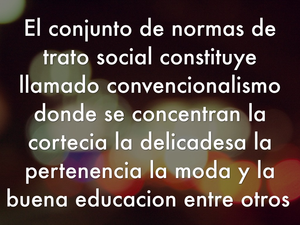 El conjunto de normas de trato social constituye llamado convencionalismo donde se concentran la cortecia la delicadesa la pertenencia la moda y la buena educacion entre otros