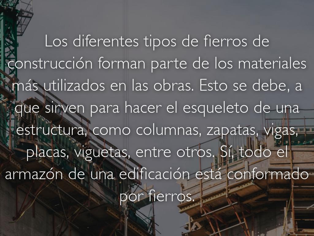 Los diferentes tipos de fierros de construcción forman parte de los materiales más utilizados en las obras. Esto se debe, a que sirven para hacer el esqueleto de una estructura, como columnas, zapatas, vigas, placas, viguetas, entre otros. Sí, todo el armazón de una edificación está conformado por fierros.