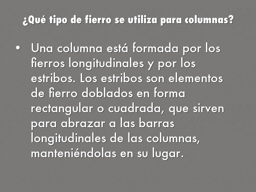 • Una columna está formada por los fierros longitudinales y por los estribos. Los estribos son elementos de fierro doblados en forma rectangular o cuadrada, que sirven para abrazar a las barras longitudinales de las columnas, manteniéndolas en su lugar.