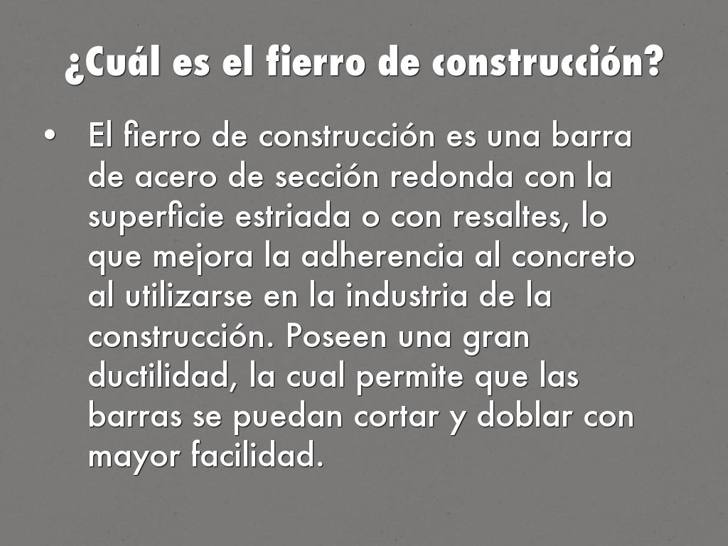 • El fierro de construcción es una barra de acero de sección redonda con la superficie estriada o con resaltes, lo que mejora la adherencia al concreto al utilizarse en la industria de la construcción. Poseen una gran ductilidad, la cual permite que las barras se puedan cortar y doblar con mayor facilidad.