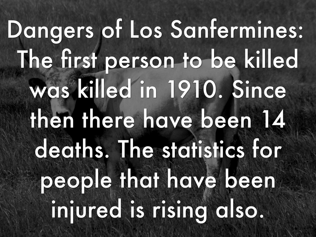 Dangers of Los Sanfermines: The first person to be killed was killed in 1910. Since then there have been 14 deaths. The statistics for people that have been injured is rising also.