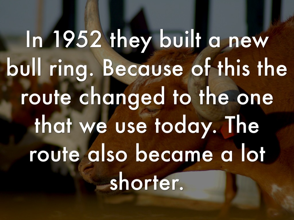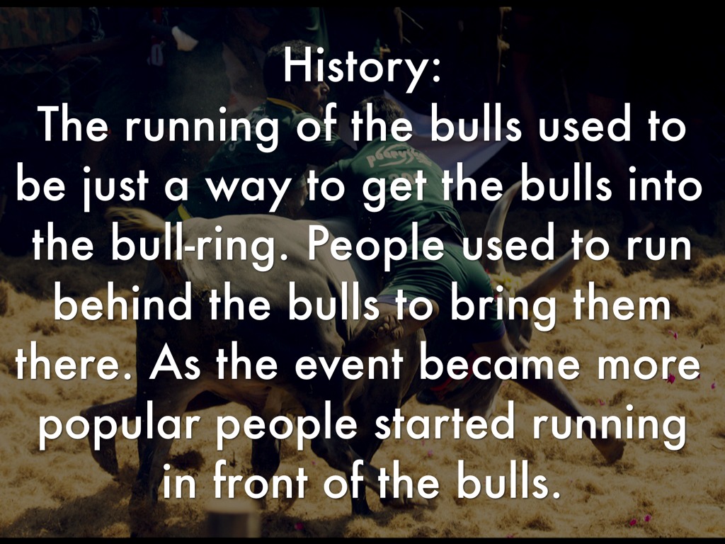 History: The running of the bulls used to be just a way to get the bulls into the bull-ring. People used to run behind the bulls to bring them there. As the event became more popular people started running in front of the bulls.