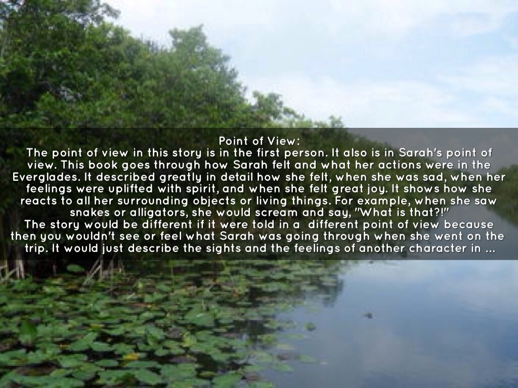 The point of view in this story is in the first person. It also is in Sarah's point of view. This book goes through how Sarah felt and what her actions were in the Everglades. It described greatly in detail how she felt, when she was sad, when her feelings were uplifted with spirit, and when she felt great joy. It shows how she reacts to all her surrounding objects or living things. For example, when she saw snakes or alligators, she would scream and say, "What is that?!"