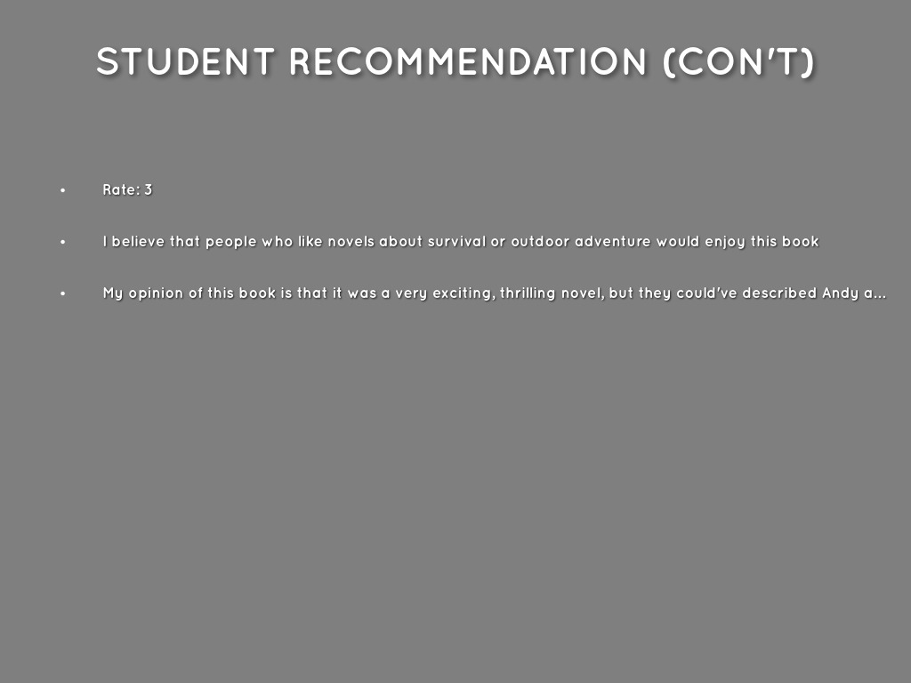 - My opinion of this book is that it was a very exciting, thrilling novel, but they could've described Andy a little better