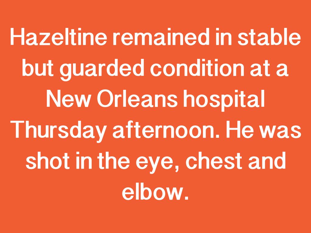 Hazeltine remained in stable but guarded condition at a New Orleans hospital Thursday afternoon. He was shot in the eye, chest and elbow.