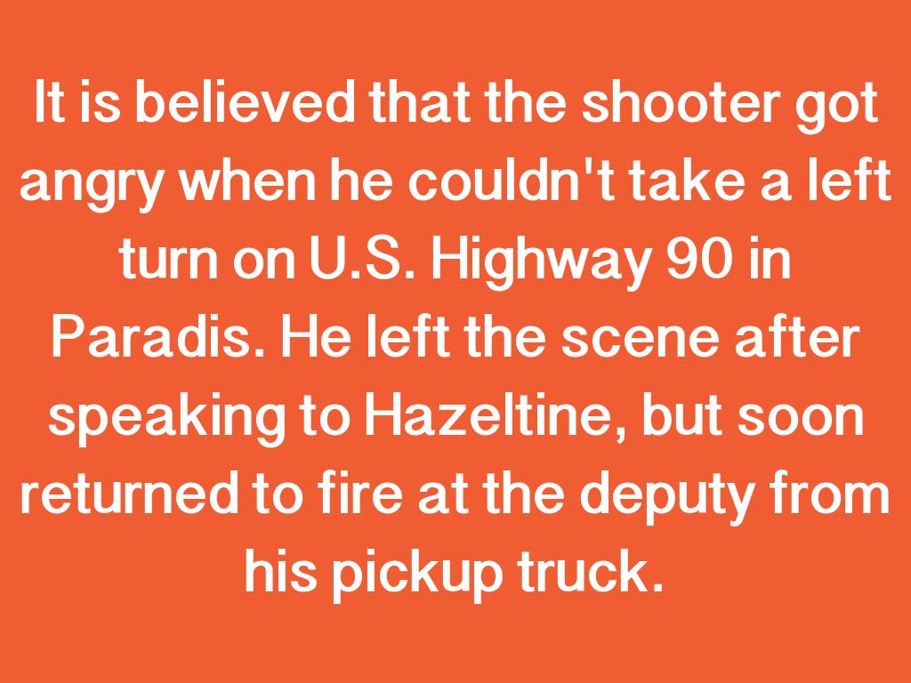 It is believed that the shooter got angry when he couldn't take a left turn on U.S. Highway 90 in Paradis. He left the scene after speaking to Hazeltine, but soon returned to fire at the deputy from his pickup truck.