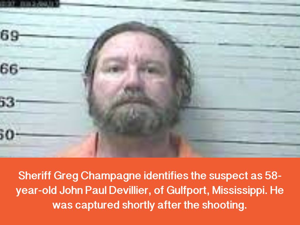 Sheriff Greg Champagne identifies the suspect as 58-year-old John Paul Devillier, of Gulfport, Mississippi. He was captured shortly after the shooting.