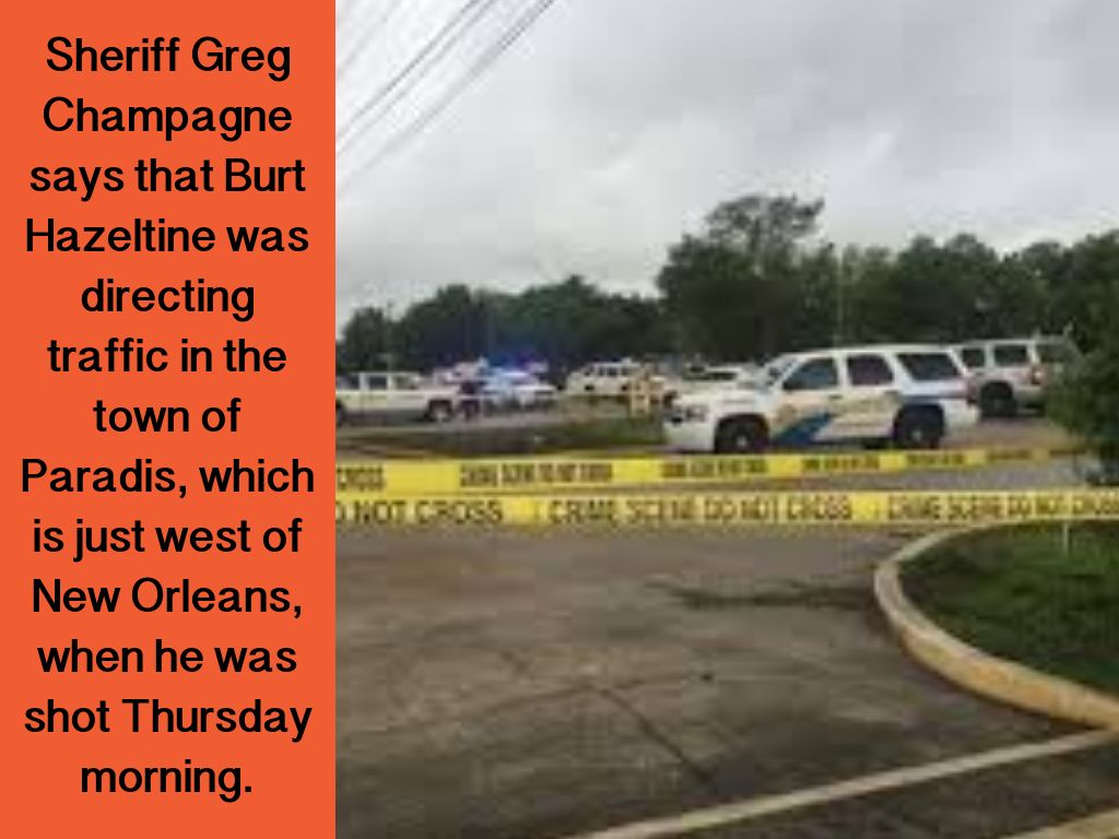 Sheriff Greg Champagne says that Burt Hazeltine was directing traffic in the town of Paradis, which is just west of New Orleans, when he was shot Thursday morning.