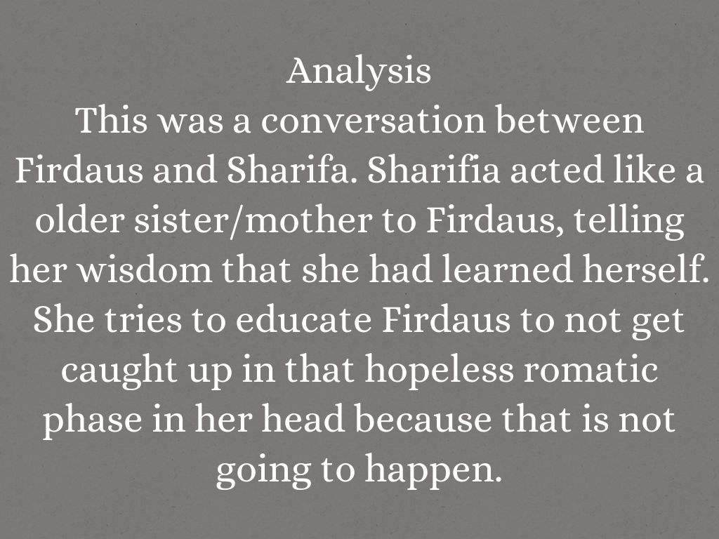 This was a conversation between Firdaus and Sharifa. Sharifia acted like a older sister/mother to Firdaus, telling her wisdom that she had learned herself. She tries to educate Firdaus to not get caught up in that hopeless romatic phase in her head because that is not going to happen.