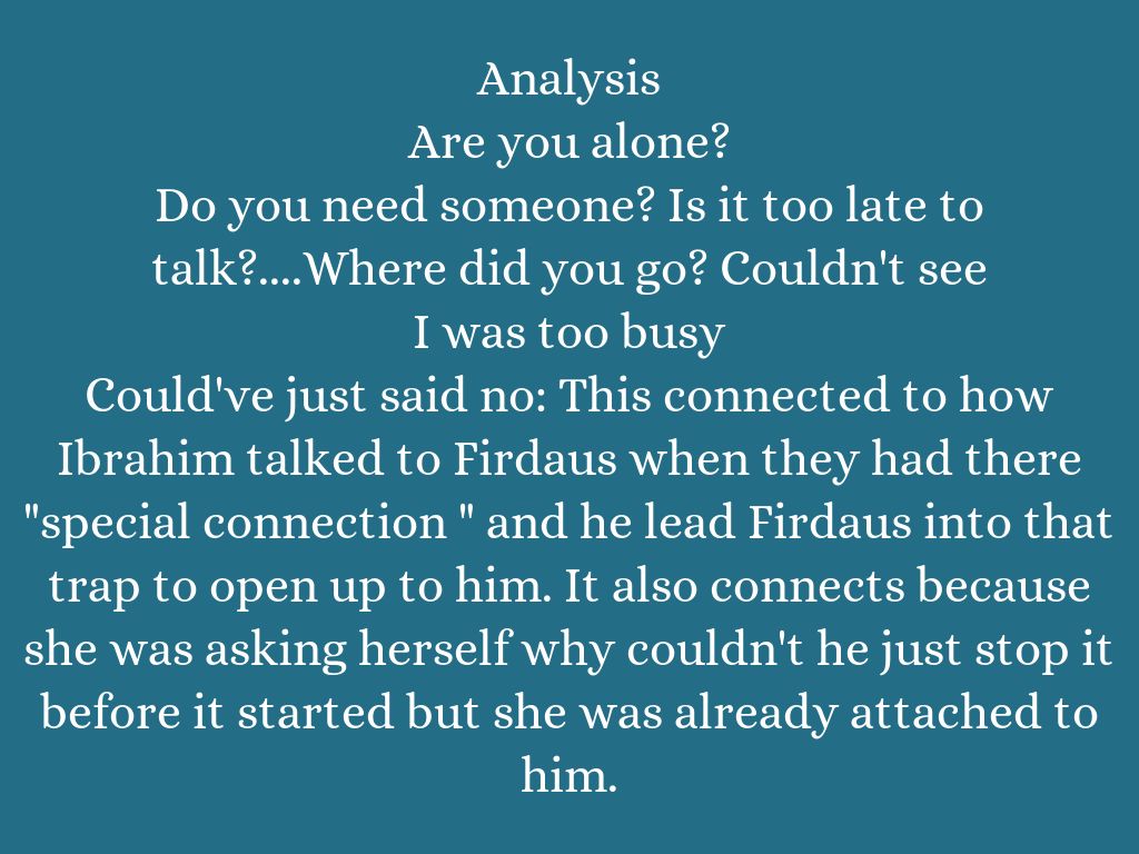 Could've just said no: This connected to how Ibrahim talked to Firdaus when they had there "special connection " and he lead Firdaus into that trap to open up to him. It also connects because she was asking herself why couldn't he just stop it before it started but she was already attached to him.