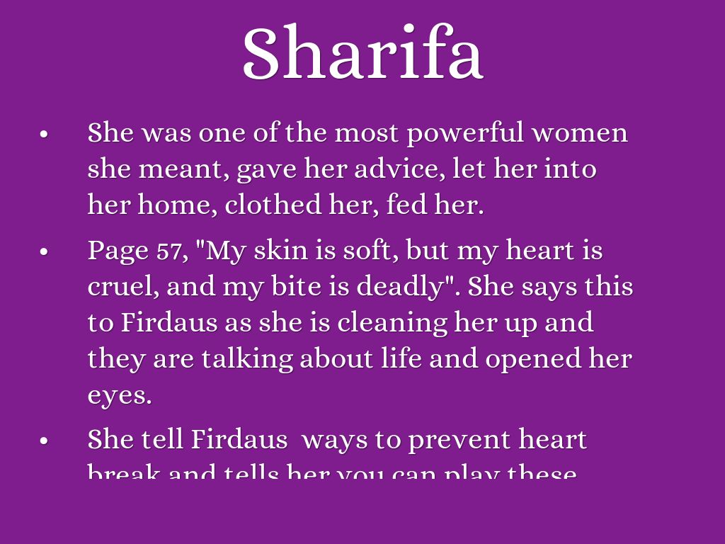 - Page 57, "My skin is soft, but my heart is cruel, and my bite is deadly". She says this to Firdaus as she is cleaning her up and they are talking about life and opened her eyes.