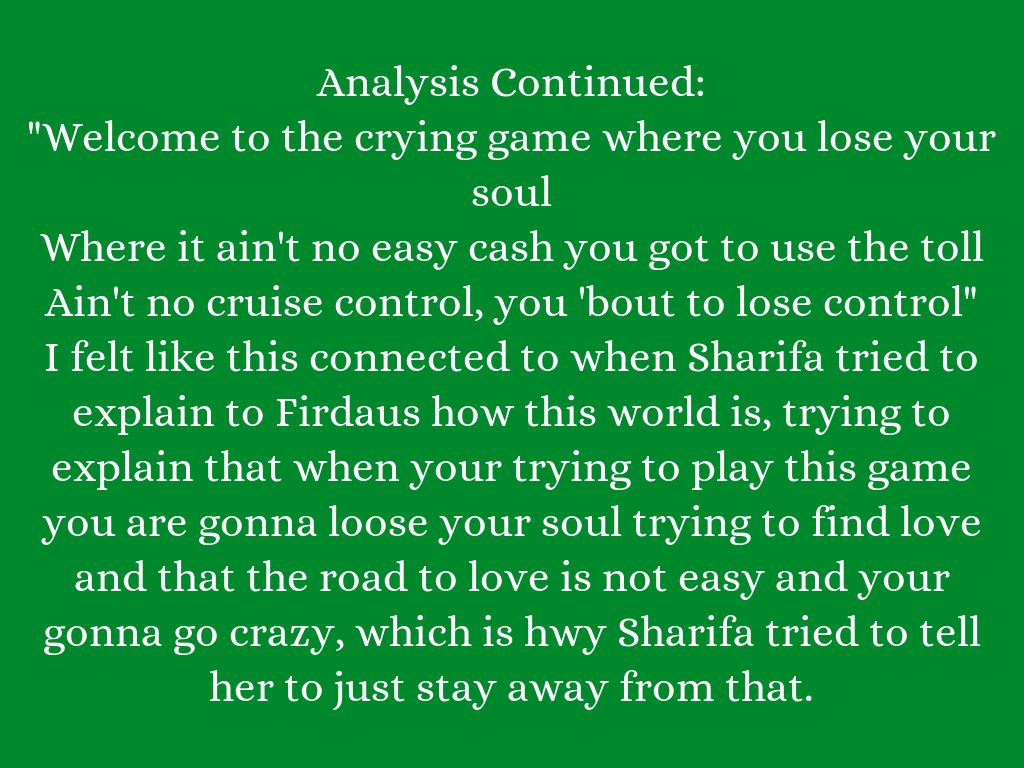 I felt like this connected to when Sharifa tried to explain to Firdaus how this world is, trying to explain that when your trying to play this game you are gonna loose your soul trying to find love and that the road to love is not easy and your gonna go crazy, which is hwy Sharifa tried to tell her to just stay away from that.