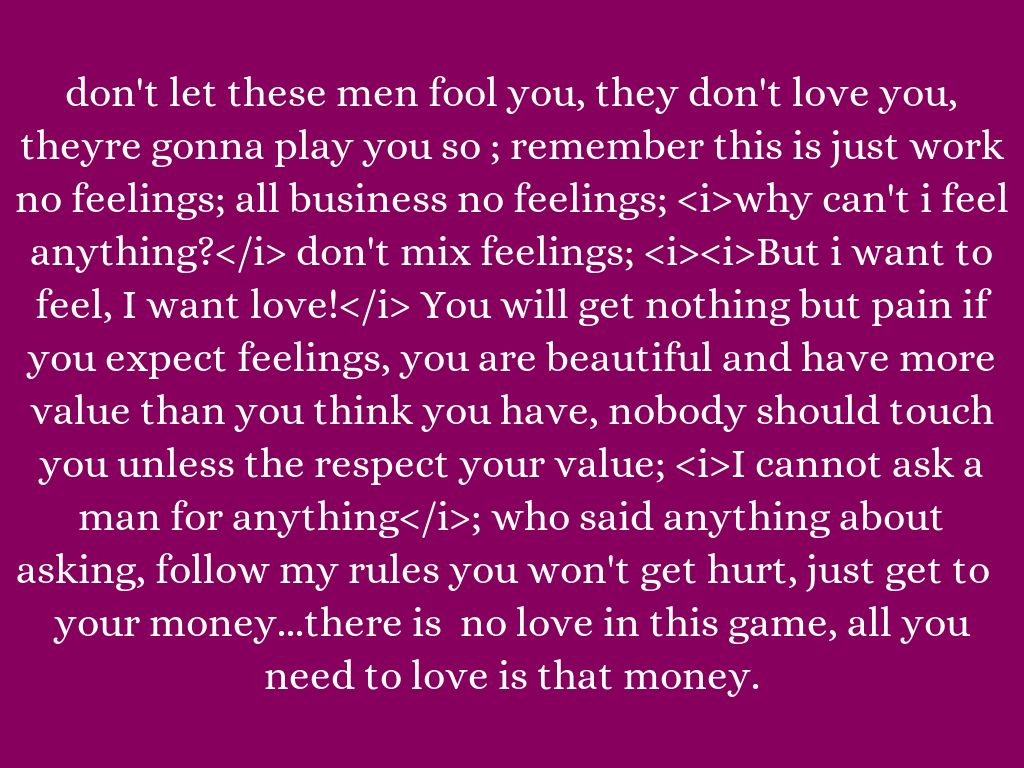 don't let these men fool you, they don't love you, theyre gonna play you so ; remember this is just work no feelings; all business no feelings; why can't i feel anything? don't mix feelings; But i want to feel, I want love! You will get nothing but pain if you expect feelings, you are beautiful and have more value than you think you have, nobody should touch you unless the respect your value; I cannot ask a man for anything; who said anything about asking, follow my rules you won't get hurt, just get to your money...there is no love in this game, all you need to love is that money.