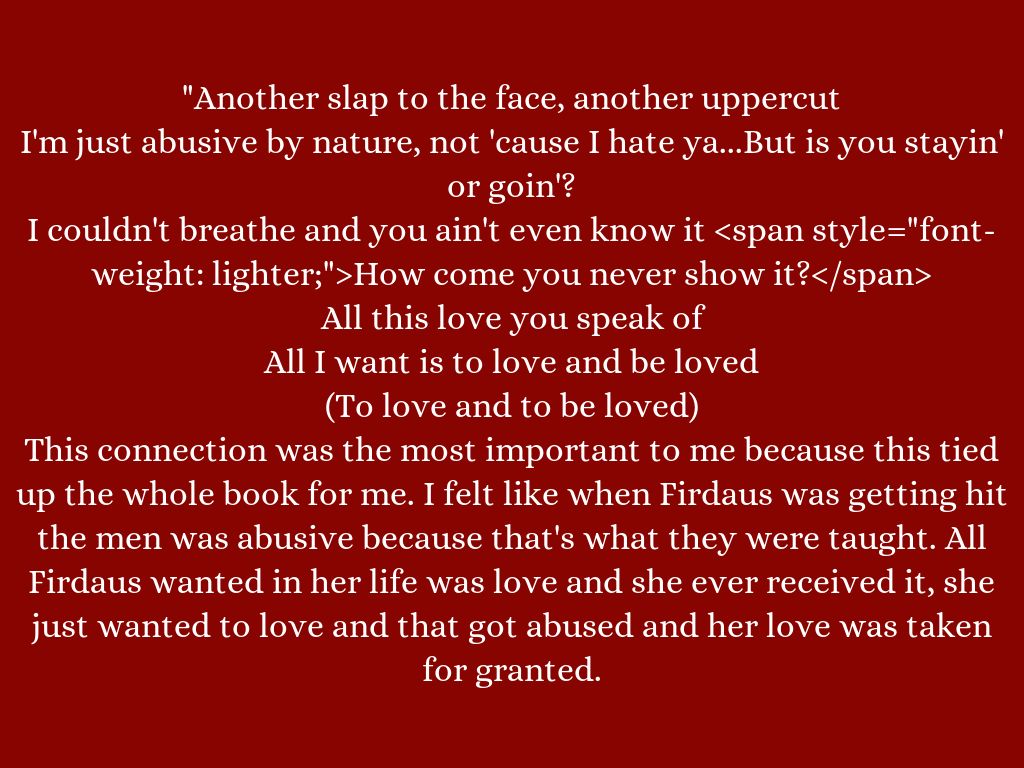 This connection was the most important to me because this tied up the whole book for me. I felt like when Firdaus was getting hit the men was abusive because that's what they were taught. All Firdaus wanted in her life was love and she ever received it, she just wanted to love and that got abused and her love was taken for granted.