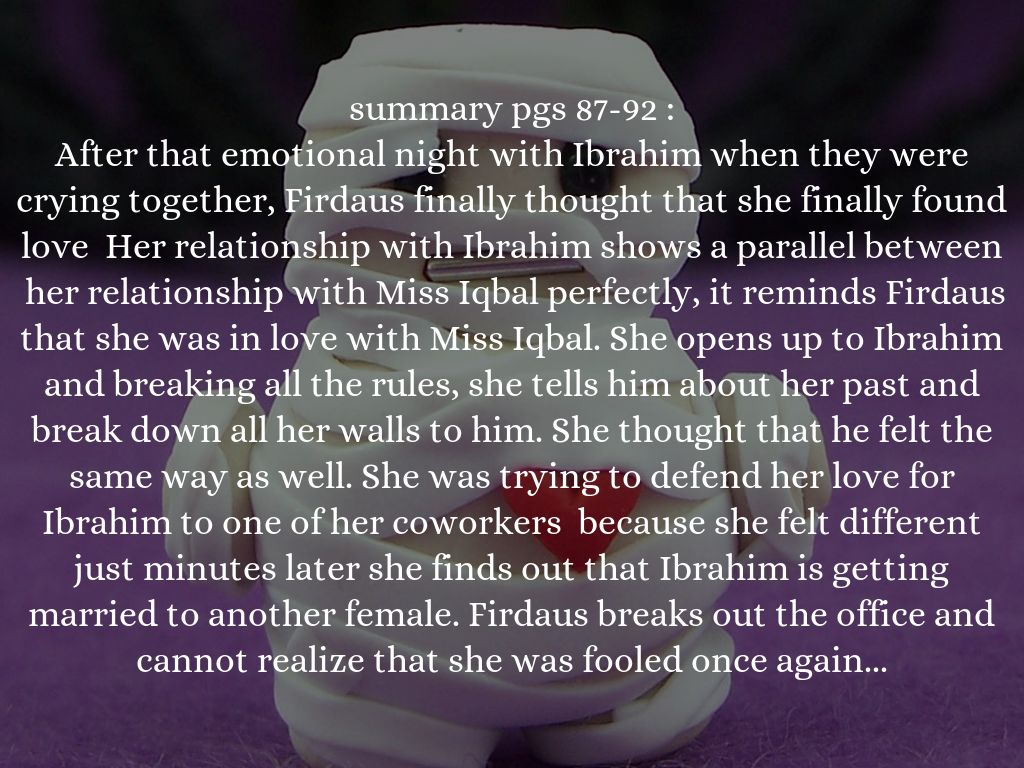 After that emotional night with Ibrahim when they were crying together, Firdaus finally thought that she finally found love Her relationship with Ibrahim shows a parallel between her relationship with Miss Iqbal perfectly, it reminds Firdaus that she was in love with Miss Iqbal. She opens up to Ibrahim and breaking all the rules, she tells him about her past and break down all her walls to him. She thought that he felt the same way as well. She was trying to defend her love for Ibrahim to one of her coworkers because she felt different just minutes later she finds out that Ibrahim is getting married to another female. Firdaus breaks out the office and cannot realize that she was fooled once again...