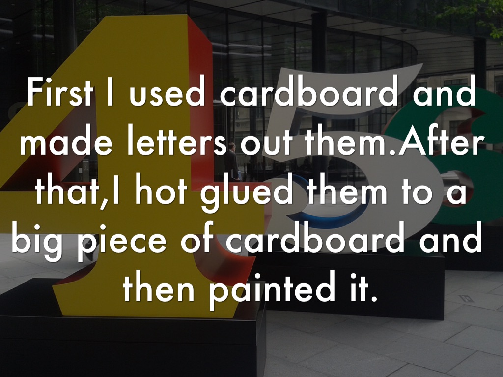 First I used cardboard and made letters out them.After that,I hot glued them to a big piece of cardboard and then painted it.
