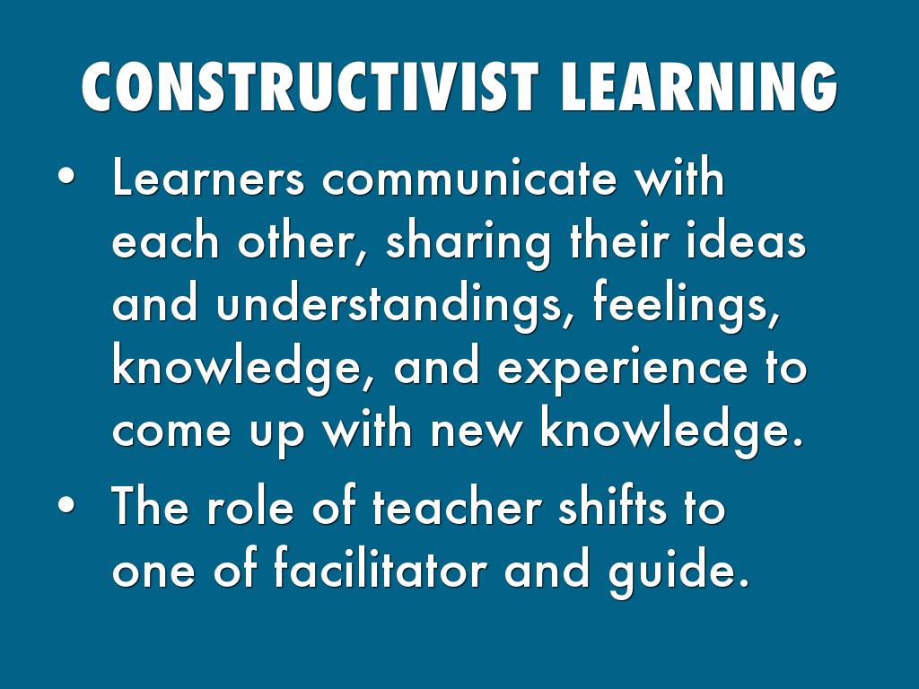 - Learners communicate with each other, sharing their ideas and understandings, feelings, knowledge, and experience to come up with new knowledge.