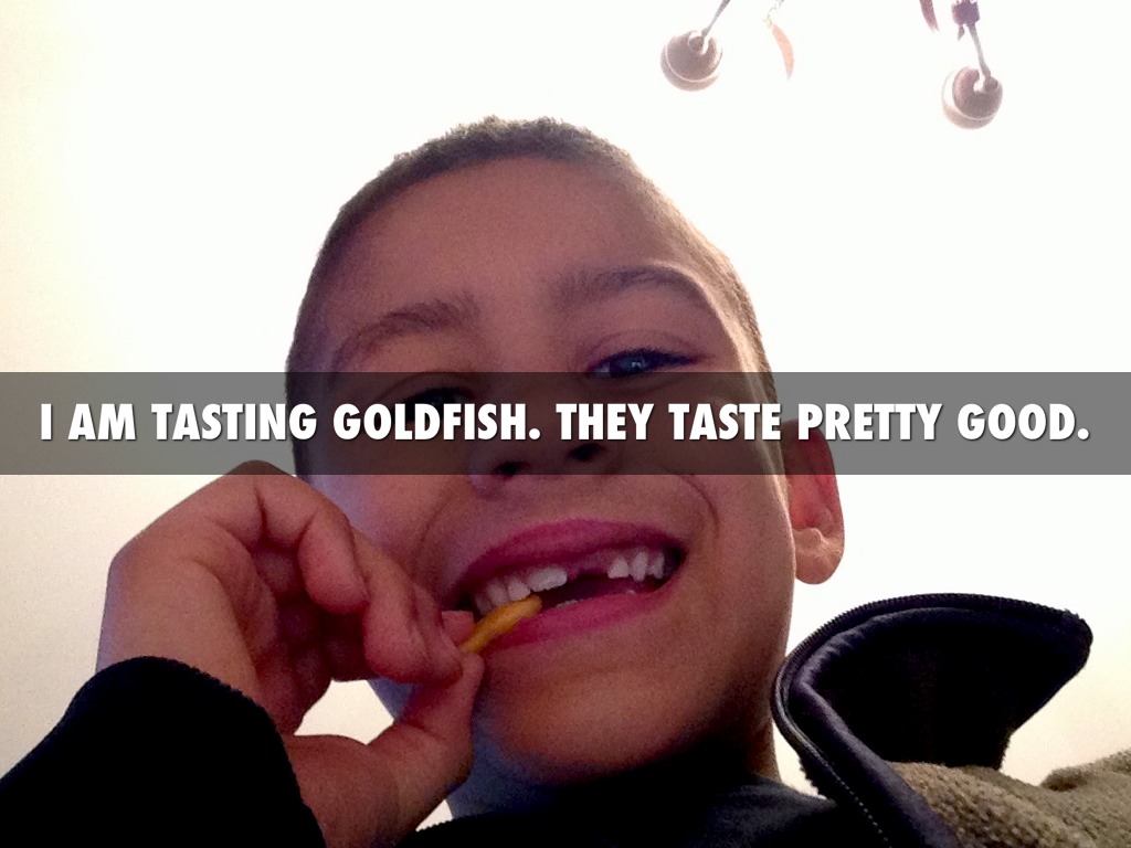I AM TASTING GOLDFISH. THEY TASTE PRETTY GOOD.
