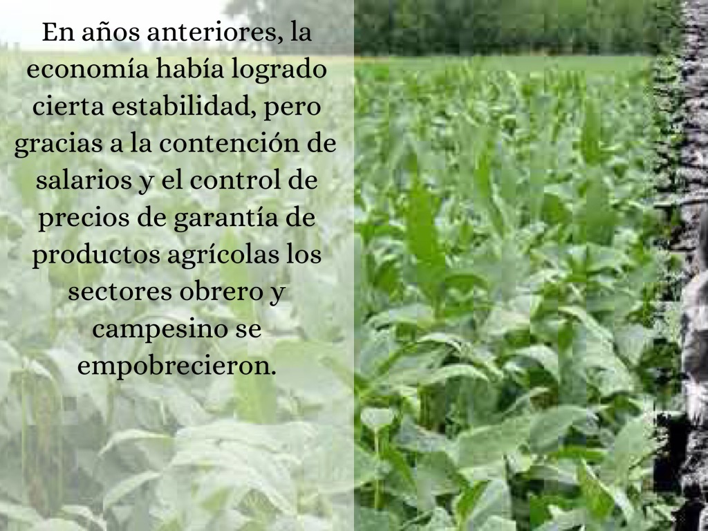 En años anteriores, la economía había logrado cierta estabilidad, pero gracias a la contención de salarios y el control de precios de garantía de productos agrícolas los sectores obrero y campesino se empobrecieron.
