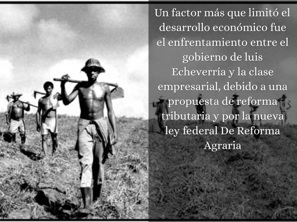 Un factor más que limitó el desarrollo económico fue el enfrentamiento entre el gobierno de luis Echeverría y la clase empresarial, debido a una propuesta de reforma tributaria y por la nueva ley federal De Reforma Agraria