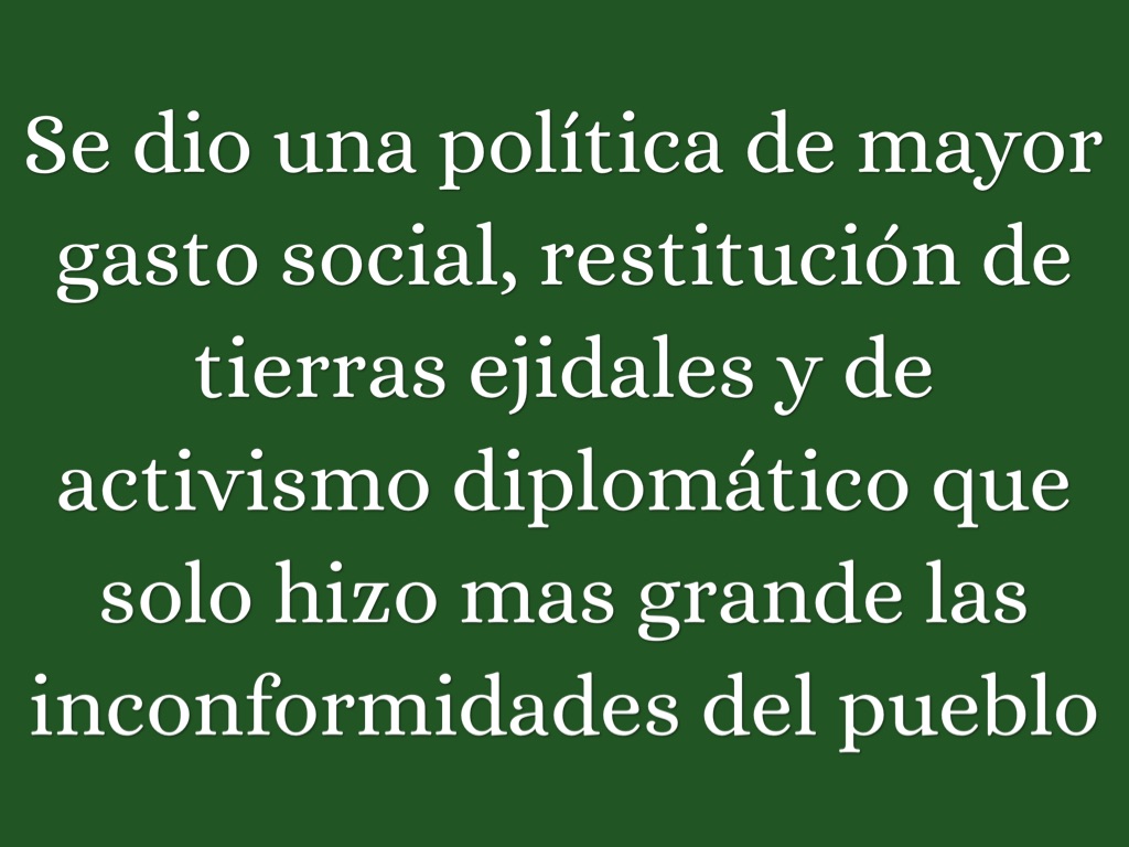 Se dio una política de mayor gasto social, restitución de tierras ejidales y de activismo diplomático que solo hizo mas grande las inconformidades del pueblo