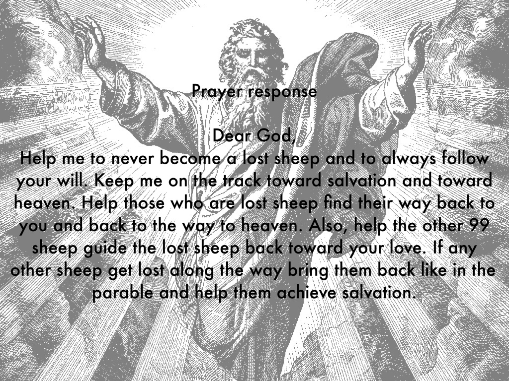 Help me to never become a lost sheep and to always follow your will. Keep me on the track toward salvation and toward heaven. Help those who are lost sheep find their way back to you and back to the way to heaven. Also, help the other 99 sheep guide the lost sheep back toward your love. If any other sheep get lost along the way bring them back like in the parable and help them achieve salvation.