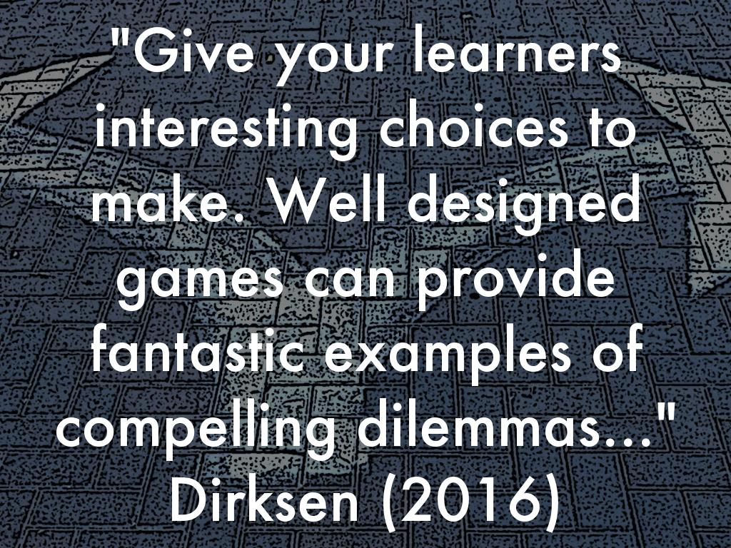 "Give your learners interesting choices to make. Well designed games can provide fantastic examples of compelling dilemmas..." Dirksen (2016)