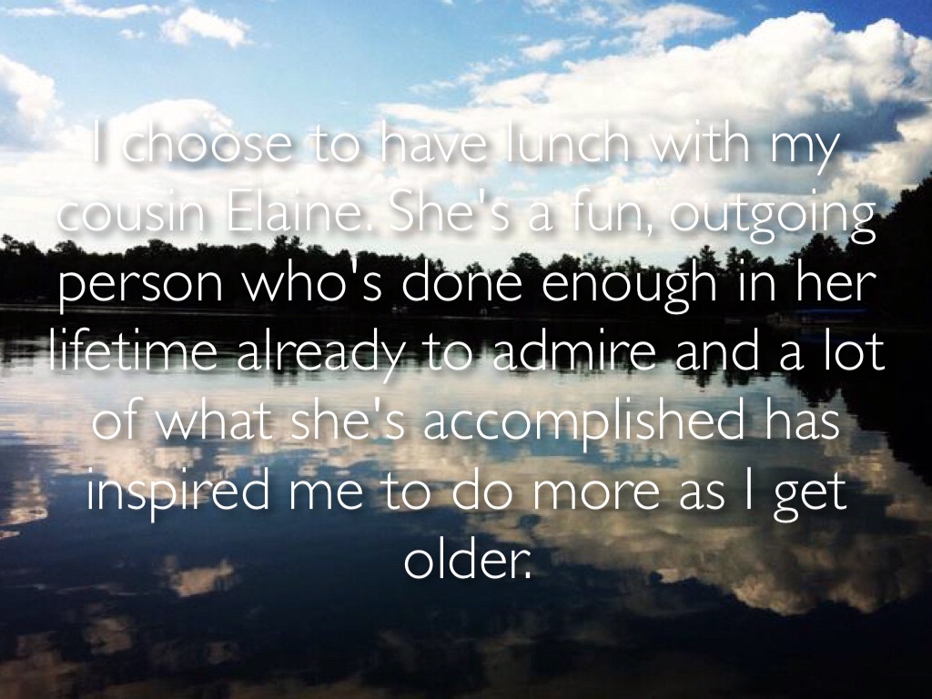 I choose to have lunch with my cousin Elaine. She's a fun, outgoing person who's done enough in her lifetime already to admire and a lot of what she's accomplished has inspired me to do more as I get older.