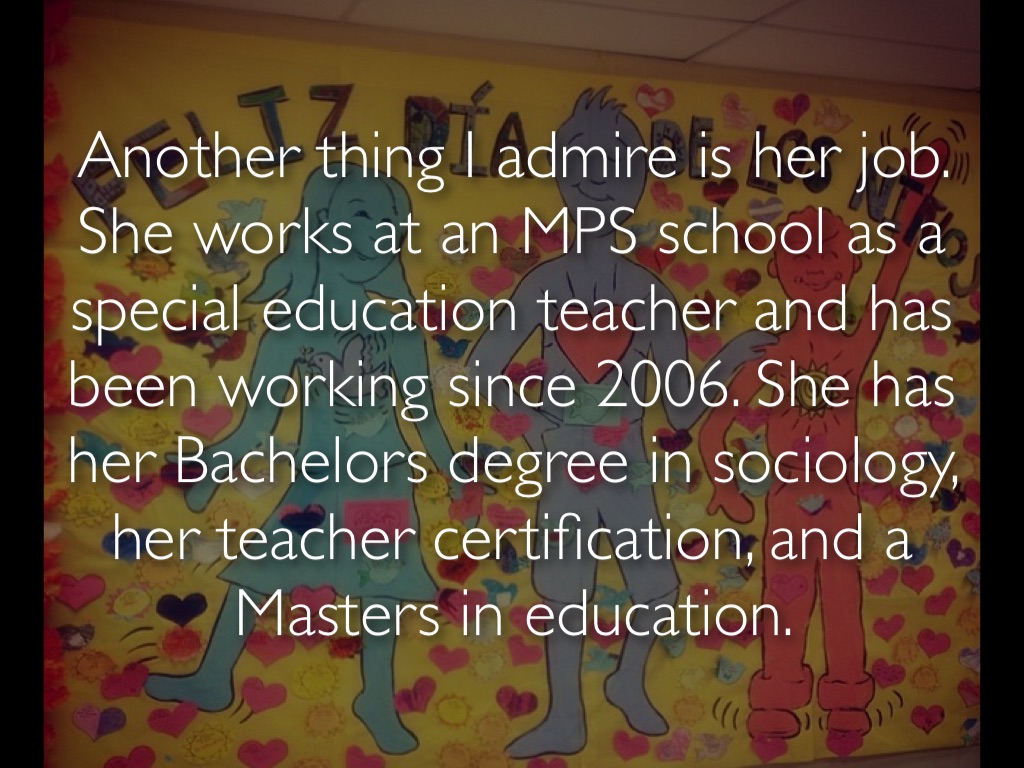 Another thing I admire is her job. She works at an MPS school as a special education teacher and has been working since 2006. She has her Bachelors degree in sociology, her teacher certification, and a Masters in education.