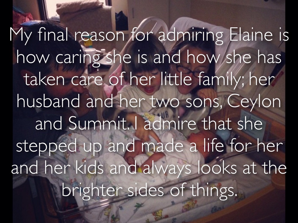 My final reason for admiring Elaine is how caring she is and how she has taken care of her little family; her husband and her two sons, Ceylon and Summit. I admire that she stepped up and made a life for her and her kids and always looks at the brighter sides of things.