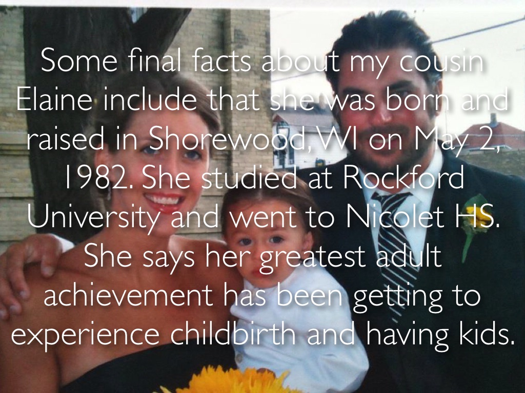 Some final facts about my cousin Elaine include that she was born and raised in Shorewood, WI on May 2, 1982. She studied at Rockford University and went to Nicolet HS. She says her greatest adult achievement has been getting to experience childbirth and having kids.