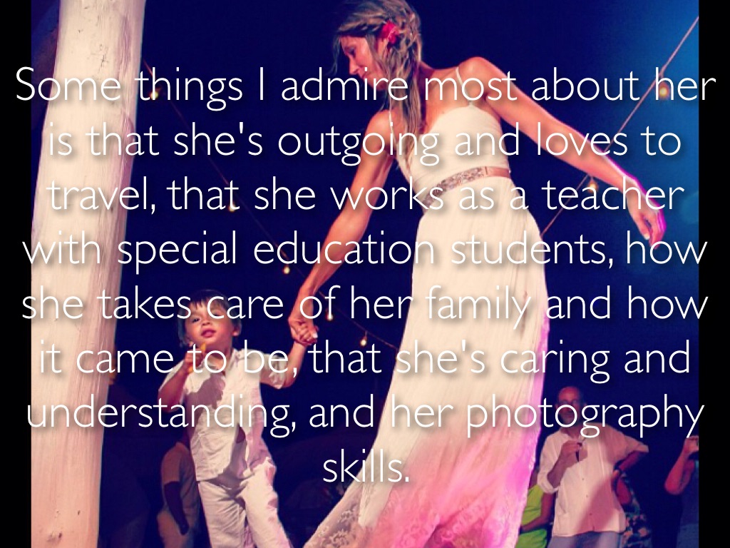 Some things I admire most about her is that she's outgoing and loves to travel, that she works as a teacher with special education students, how she takes care of her family and how it came to be, that she's caring and understanding, and her photography skills.