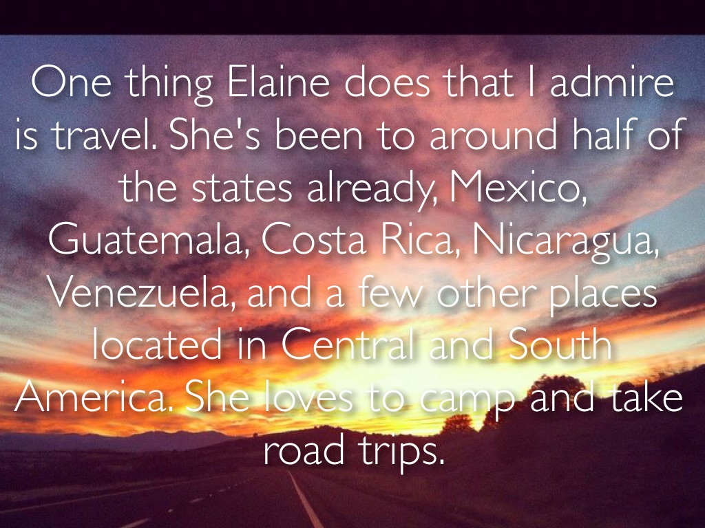 One thing Elaine does that I admire is travel. She's been to around half of the states already, Mexico, Guatemala, Costa Rica, Nicaragua, Venezuela, and a few other places located in Central and South America. She loves to camp and take road trips.