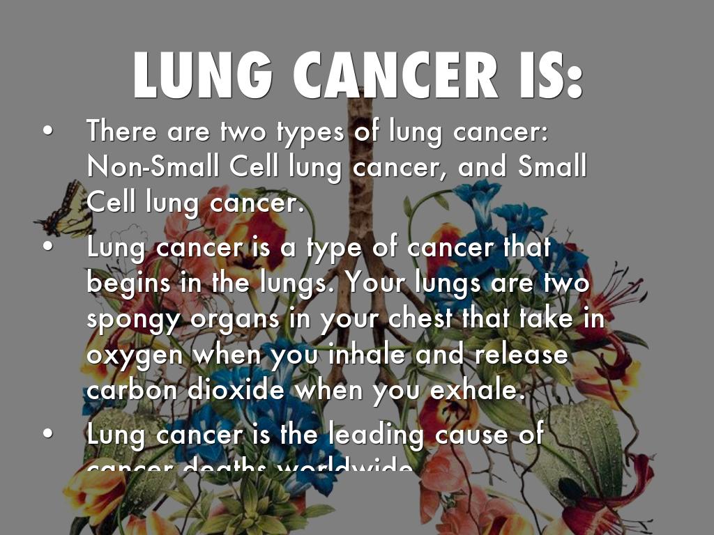 Lung cancer is a type of cancer that begins in the lungs. Your lungs are two spongy organs in your chest that take in oxygen when you inhale and release carbon dioxide when you exhale.