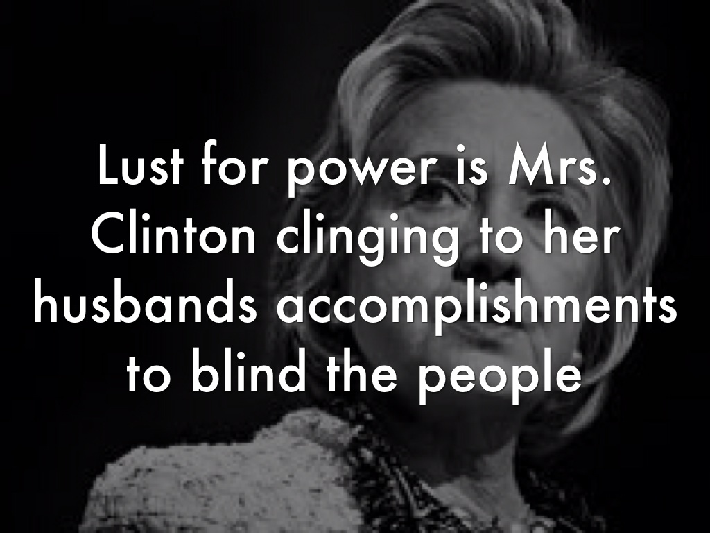 Lust for power is Mrs. Clinton clinging to her husbands accomplishments to blind the people