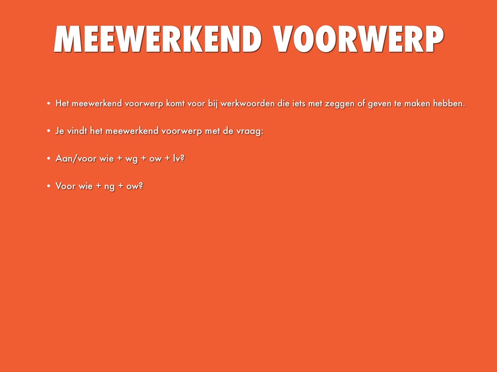 • Het meewerkend voorwerp komt voor bij werkwoorden die iets met zeggen of geven te maken hebben.
