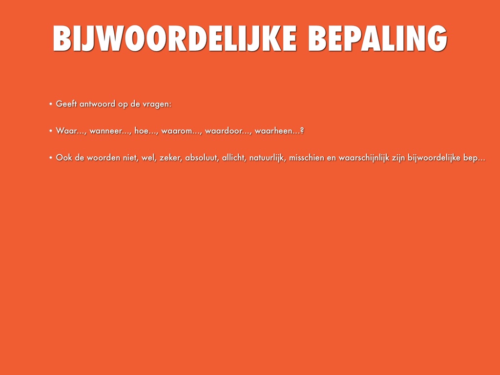 • Ook de woorden niet, wel, zeker, absoluut, allicht, natuurlijk, misschien en waarschijnlijk zijn bijwoordelijke bepaling.
