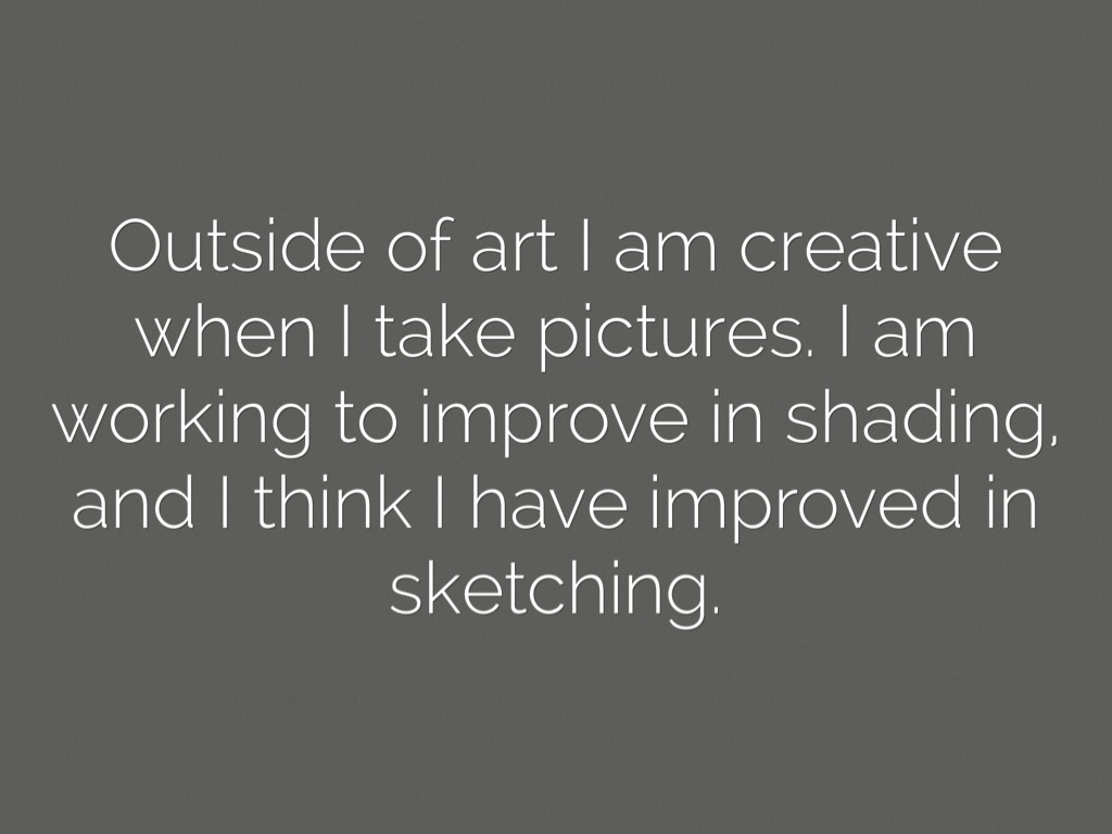 Outside of art I am creative when I take pictures. I am working to improve in shading, and I think I have improved in sketching.