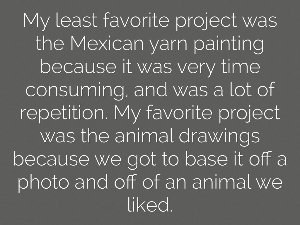 My least favorite project was the Mexican yarn painting because it was very time consuming, and was a lot of repetition. My favorite project was the animal drawings because we got to base it off a photo and off of an animal we liked.