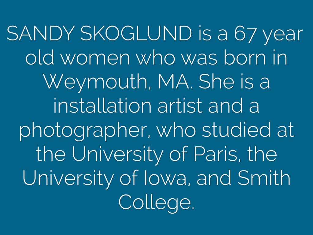 SANDY SKOGLUND is a 67 year old women who was born in Weymouth, MA. She is a installation artist and a photographer, who studied at the University of Paris, the University of Iowa, and Smith College.