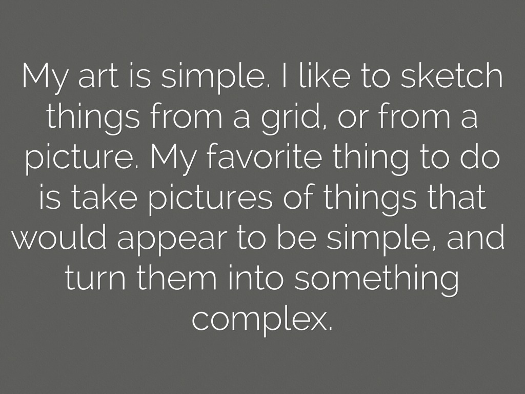 My art is simple. I like to sketch things from a grid, or from a picture. My favorite thing to do is take pictures of things that would appear to be simple, and turn them into something complex.
