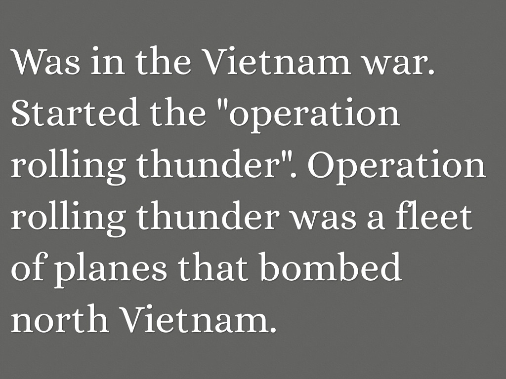 Was in the Vietnam war. Started the "operation rolling thunder". Operation rolling thunder was a fleet of planes that bombed north Vietnam.