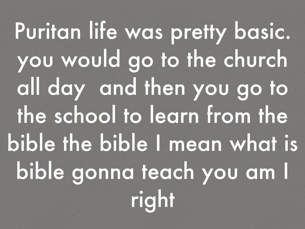 Puritan life was pretty basic. you would go to the church all day and then you go to the school to learn from the bible the bible I mean what is bible gonna teach you am I right